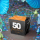 Célébrez le big five oh avec ce design moderne élégant, qui comprend un bloc noir, blanc et orange frappant et des lettres écrites à la main sur un gris fumée à un riche arrière - plan noir. Reverse affiche un design identique. Design © W.H. Sim. Voir plus sur zazzle.com/expressionsoccasions