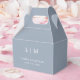 Un Ballotin de mariage simple mais élégant avec un design minimaliste moderne avec votre monogramme de deux lettres avec vos noms et votre date. Tous les éléments de conception sont en blanc sur un arrière - plan bleu poussiéreux et peuvent être changés dans l'outil d'édition de conception. Ces boîtes de Faveur Mariage classique vont bien avec n'importe quel style de mariage.