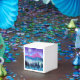 Un paysage abstrait avec des couleurs et des textures uniques montrant une scène de montagne avec des arbres et brouillard dans les tons violet, bleu, turquoise et cyan.