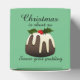 Des ballotins de Noël avec un avant et un dessus en forme de coeur avec le slogan "Noël est court, alors savourez votre pudding" avec un pudding de Noël décoré de saint.