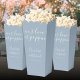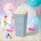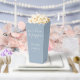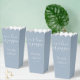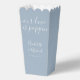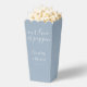 Élégante boîte de pop-corn de mariage avec des noms de signature stylisés et une date spéciale dans une typographie moderne sur un fond bleu poussiéreux. Conçu par Thisisnotme©
