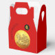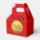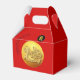 Composition avec papier traditionnel chinois doré coupé d'un Dragon dans un cercle doré + petit lettrage moderne pour l'année du Dragon 2024 et symbole d'idéogramme chinois Dragon sur un petit cercle noir. Conception sur ballotin gable + Nom et adresse professionnelle pour customiser avec arrière - plan rouge. Disponible en cube, tente et ballotins à emporter. Carte de voeux, carte postale de vacances, invitation et plus bientôt. Parfait pour le Nouvel An Chinois du Dragon 2024 ou anniversaire (personnes nées dans l'Année du Dragon).