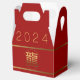 Idéogramme de dragon chinois doré avec un effet numérique en relief sur fond transparent. Conception sur coffret cadeau en forme de pignon de porte avec textes : BONNE ANNÉE, grand 2024 et adresse du nom de l'entreprise sur fond rouge foncé. Vous pouvez facilement modifier le texte (police, couleur, taille et position), la couleur de fond, la taille du design en cliquant sur le bouton personnaliser. Disponible en boîte cube et plus encore... Produits pour la maison assortis, produits de bureau, fournitures artisanales, carte de vœux et plus encore... Parfait pour le Nouvel An chinois de l'année du Dragon ou pour un anniversaire (personnes nées l'année du Dragon).
