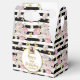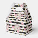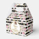 Un ballotin super mignon avec photo et texte personnalisé entouré d'un accent or et placé contre un arrière - plan rayé noir et blanc accentué de papillons dorés, roses roses et marguerites blanches. Parfait pour tout âge anniversaire, mariage ou baby shower, mariage, retraite, anniversaire, diplôme et plus.