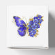 Bijoux, bleu, saphir, papillon aux fleurs pétillantes avec aile décorée de bleu, fleurs précieuses avec feuilles d'or sur arrière - plan blanc.