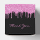 Pour une fête d'anniversaire de 21e (ou tout âge), favorise. Une couleur arrière - plan noire chic. A l'avant et à l'arrière : Le texte : 21ème anniversaire et Merci écrit avec un script de style manuscrit moderne. Décoré avec des gouttes de parties scintillant rose, la peinture goutte à goutte. Personnalisez et ajoutez un nom et une date. Texte rose.