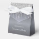 Un faux arrière - plan métallique à l'allure argentée avec parties scintillant faux argent goutte à goutte, un peu de bling et de luxe pour vos faveurs de Noël. Arbres de Noël, forêt d'hiver comme décor à l'arrière. Avec le texte : Fête de Noël écrite avec un script de style à la main moderne. Modèle pour Votre nom de famille et un an, des lettres blanches. Moderne, simple et élégant.