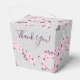 Un joli cerisier rose fleurit sur un arrière - plan de parties scintillant argentées. Avec une expression de remerciement et les noms de mariés et mariés dans une police manuscrite élégante et la date mariage.