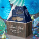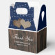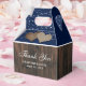 Rustique bleu marine mariage merci ballotin avec burlap, bois rustique et lampes à cordes. Ces boîtes de bienvenue texturées rustiques sont parfaites pour une fête de mariage campagnard bleu marine. Personnalisez facilement nos boîtes de faveurs de mariage avec vos détails d'événement. Ces ballotins de remerciement peuvent être facilement personnalisés à d'autres occasions, comme des douches nuptiales rustiques.