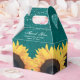 Boîte de faveur de mariage turquoise rustique personnalisée avec un arrière - plan burlap turquoise avec tournesol. Personnalisez facilement ce ballotin floral turquoise avec les détails de votre événement.