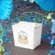 Le ballotin d'anniversaire de ce garçon mignon et kawaii présente une boulette avec un visage souriant et des coeurs bleus dans un vapeur chinois sur un arrière - plan blanc avec des motifs à vagues grises. Personnalisez-le selon vos besoins. REMARQUE : Veuillez noter que les dimensions de la boîte de décollage sont de 2"w x 2"l x 2.75"h.