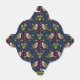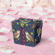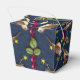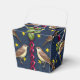 Le motif original sur ce Ballotin Take Out a commencé comme une illustration originale de ZoeSPEAK de petits oiseaux chanteurs. Les oiseaux se font face, comme s'ils chantaient, contre un profond arrière - plan bleu marine parsemé de minuscules étoiles jaunes. Il y a des rangées verticales de rubans rouges tourbillonnés, avec des groupes de feuilles verts entre les petits oiseaux bruns.