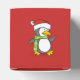 Un petit dessin de pingouin avec chapeau santa et écharpe verte marchant sur la neige.