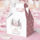 This charming Christmas favor box features a soft watercolor illustration of a pink cottage nestled among snowy evergreens and bare winter trees. The elegant "Merry Christmas" greeting is printed in a delicate serif font, adding a cozy and festive touch. Customizable with a family name, this whimsical box is perfect for presenting small gifts, party favors, or holiday treats, spreading warmth and joy to your seasonal celebrations.