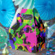 Dessin de peinture audacieux en rose chaud, jaune, orange, vert citron, violet turquoise et bleu sur un arrière - plan noir.