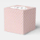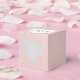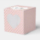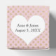 Cœur blanc avec les noms des jeunes mariés sur fond rose poudré et motif de points dorés brillants.