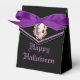 Ce Ballotin d'Halloween présente un portrait d'un squelette, sur le rabat avant. En bas, le texte dit : "Happy Halloween". Sur le dos de la boîte il y a un squelette tête portant un chapeau supérieur. Vous pouvez customiser cette zone en ajoutant votre propre texte et en modifiant la couleur du ruban. La couleur arrière - plan peut également être customisée.