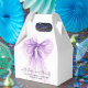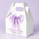 Elegant bridal shower party favor gift boxes featuring a purple coquette bow watercolor, "with love and thanks" showcased in a chic modern script, and the bride's name and shower date in simple lettering.