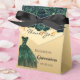 Ce ballotin élégant, classique et féminin est un cadeau parfait à offrir à une quinceañera. Un arrière - plan doré, des roses vert émeraude et une robe. Avec le texte : Quinceañera et Merci. Personnalisez et ajoutez votre nom et votre date pour une touche personnelle supplémentaire !