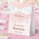 Elégant, classique, glamour et girly pour une Quinceañera, fête du 15ème anniversaire favorise. doré rose, arrière - plan à dégradé rose vif, décoré de banquettes de soirée. Avec le texte : Quinceañera et Merci écrit avec un rose moderne couleur foncé écriture de style lettré à la main. Personnalisez et ajoutez un nom et une date.