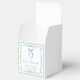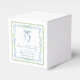 Élégantes boîtes de faveurs de fête de baby shower avec des cadres en aquarelle florale bleue et à coquille verte, un délicat ruban coquette bleu en aquarelle, "amour + merci" mis en valeur dans une écriture calligraphique bleue élégante, et le nom de la mariée et la date de la douche dans une typographie serif classique.