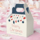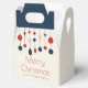 Jolie rétro Joyeux Noël boîte de faveur avec des ornements de style 70 vintages en rouge, bleu et ivoire au-dessus de votre nom de famille. De beaux ballotins nostalgiques pour une fête de vacances.
