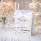 Elégant, classique, glamour et girly pour une Quinceañera, fête du 15ème anniversaire favorise. Un arrière - plan à l'aspect métallique faux argent avec poussière de parties scintillant violet et une robe. Avec le texte : Quinceañera et le Merci écrit avec un script moderne de style écrit. Personnalisez et ajoutez un nom et une date.