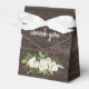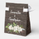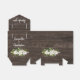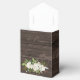 Elégant ballotin de mariage pour un mariage rustique chic. Commence avec un riche motif de bois brun chocolat foncé. Des roses blanches et des feuilles vert vif sont placés au bas de l'avant et de l'arrière. Un ruban blanc éclatant et un arc créent une belle bordure supérieure. Le Merci est inscrit sur le rabat avant de la boîte de réception du mariage.