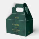 Royal Emerald Green Monogram Mariage Ballotins Merci. Ces boîtes de mariage Royal Emerald Green Favor dégagent une élégance intemporelle. La boîte entière est enveloppée d'une riche teinte vert émeraude. Sur le devant, les noms du couple sont élégamment affichés en or, accompagnés de la date mariage. Le dos express la gratitude avec un message simple mais sincère de "Merci". La touche de couronnement est les initiales du couple, discrètement monogrammées sur les deux côtés et les volets supérieurs, ajoutant une touche de sophistication personnalisée. Ces boîtes créent un look simple mais indéniablement royal, ce qui en fait l'accompagnement parfait à toute faveur de mariage