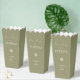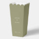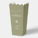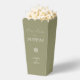 Modern minimal wedding popcorn favor boxes with chic and stylish appeal. The design features a contemporary set of fonts in white, against a lovely sage green background.