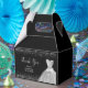 A beautiful silver themed elegant watercolor dress gown on a black background with faux glitter at the top and bottom of the favor box.