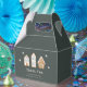 Whimsical Christmas theme baby shower favor box featuring illustration of gingerbread houses with blue accents.