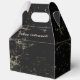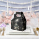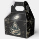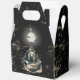 Sorcière Hantée Gothique Halloween Costume Fête Faveur Boîtes. Ces ballotins présentent un design gothique foncé avec un arrière - plan noir brumeux. Des accents dorés rustiques ornés encadrent la carte, tandis que le titre de l'événement, "Haunted Halloween" est affiché dans un étrange script gothique doré. L'image subtile d'une sorcière éffrayante mélangeant sa potion magique et une pleine lune renforce l'atmosphère étrange. Facile à modifier avec votre texte sur le dos.