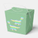Des dinosaures rayés verts et bleus sur des ballotins de fête d'anniversaire customisés de mignons enfants.