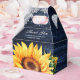 Mettez vos cadeaux de mariage ou de douche nuptiale dans ces élégantes boîtes de mariage rustiques bleu marine et tournesol avec des tournesols, des lampes à cordes et du blanc sur un arrière - plan en bois rustique.