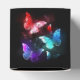 Trois papillons lumineux, rouges, violets, verts, texturés, nocturnes sur arrière - plan noir lumineux.