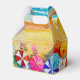 Vagues sur une plage de sable et baigneurs sous des parasols colorés, les boîtes de faveur de pignon sont amusantes pour toutes les occasions estivales.