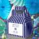 A modern yet retro-inspired beach bachelorette favor boxes featuring navy blue and white stripes for a crisp, nautical feel. The main heading reads “The Bach Club” in a striking blend of modern sans-serif and vintage script typography, balancing minimalist clarity with classic elegance. At the center, a hand-drawn palm tree illustration anchors the design, flanked by two clam sea shells on each side—adding a touch of old money coastal charm and luxury seaside vibes. The overall aesthetic blends classic luxury with minimalist design, evoking a timeless yet fresh look that feels perfect for a chic beach celebration.