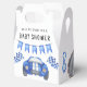Carte d'invitation baby shower à thème de voiture de course avec des illustrations aquarelle d'une voiture de course bleue.