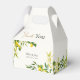 Fresh watercolor lemons and eucalyptus greenery wrap around this elegant gable favor box, with a “Thank You” script and customizable couple’s names and wedding date on the front panel. Perfect for holding cake slices, sweets, or small gifts, this citrus wedding favor box coordinates with a full lemon stationery suite for summer, garden, Mediterranean, Italian and citrus-themed weddings.