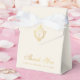 An elegant ivory and gold wedding favor box. On the flap, it has faux gold foil crest with a monogram in it, from 2 initials.