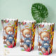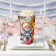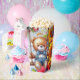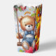 A happy bear on a swing on a popcorn carton box perfect for a child party.