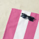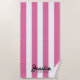 Cette serviette de plage rayée rose et blanc peut être personnalisée avec un nom et un titre de fête de mariée en cliquant sur "personnaliser ce modèle."