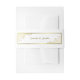 Cette belle bande de ventre tiendra vos invitations et enclos ensemble, rendant la présentation plus classe, élégant et élégant. Le design classique de l'or et du blanc présente vos noms en écriture chic à l'intérieur d'une boîte en faux feuille d'or avec des boucles ornées et des tourbillons dans les coins. Merveilleuse façon d'ajouter cette touche finale à votre suite d'invitation.