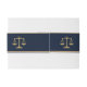 This announcement belly band features a refined scales of justice emblem paired with classic calligraphy, framed within a professional navy layout with gold accents. The legal symbol provides immediate context while maintaining formal restraint.