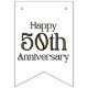Cette banderole comporte les mots "Joyeux 50e anniversaire" dans une police d'impression unique avec des lettres dorées et un contour noir. Toutes les bannières ont une impression unilatérale, sont sécuritaires pour l'extérieur, fabriquées en polystyrène plastique robuste et la corde en plastique épais comporte (16) drapeaux en queue d'hirondelle de 5,5" x 8" sur une ficelle de 6' de long.