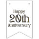 Cette banderole comporte les mots "Joyeux 20e anniversaire" dans une police d'impression unique avec des lettres dorées et un contour noir. Toutes les banderoles ont une impression unilatérale, sont sécuritaires pour l'extérieur, fabriquées en plastique polystyrène robuste et en corde en plastique épais, et comportent (16) drapeaux en queue d'hirondelle de 5,5" x 8" sur une corde de 6 pieds de long.