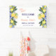 Élevez votre douche de mariée avec notre bannière de bienvenue en carreaux bleus de citron méditerranéen italien. Ce design enchanteur présente des citrons et des roses roses aquarelles vibrants, complétés par un motif de carreaux bleus italiens méditerranéens complexes avec le texte "Ciao Bella" en calligraphie sur lettrage rose sur fond blanc. Cette bannière promet d'apporter l'attrait du charme méditerranéen à votre fête de douche de mariée estivale. Vous pouvez facilement modifier votre texte, vos polices et vos couleurs en cliquant sur les outils de personnalisation. Vous pouvez transférer ce design sur une variété de produits sans effort.