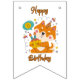 Cette banderole affiche les mots "Joyeux Anniversaire" dans une police d'impression unique avec des lettres orange et un contour noir avec un chien Shiba Inu tenant un cupcake avec des autocollants de fête et des rubans dans le fond dans ce thème et style d'anniversaire. Toutes les banderoles ont une impression unilatérale sûre pour l'extérieur, fabriquées en plastique polystyrène robuste et une corde en plastique épaisse avec (16) drapeaux en queue d'hirondelle de 5,5" x 8" sur une corde de 6' de long.