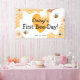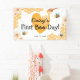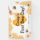 Bannière "First Bee-Day". Le design présente une décoration sucrée en nid d'abeille, du miel, un coeur jaune, d'adorables abeilles, de jolies fleurs margueuses et un modèle de bannière d'anniversaire amusant qui est facile à customiser.